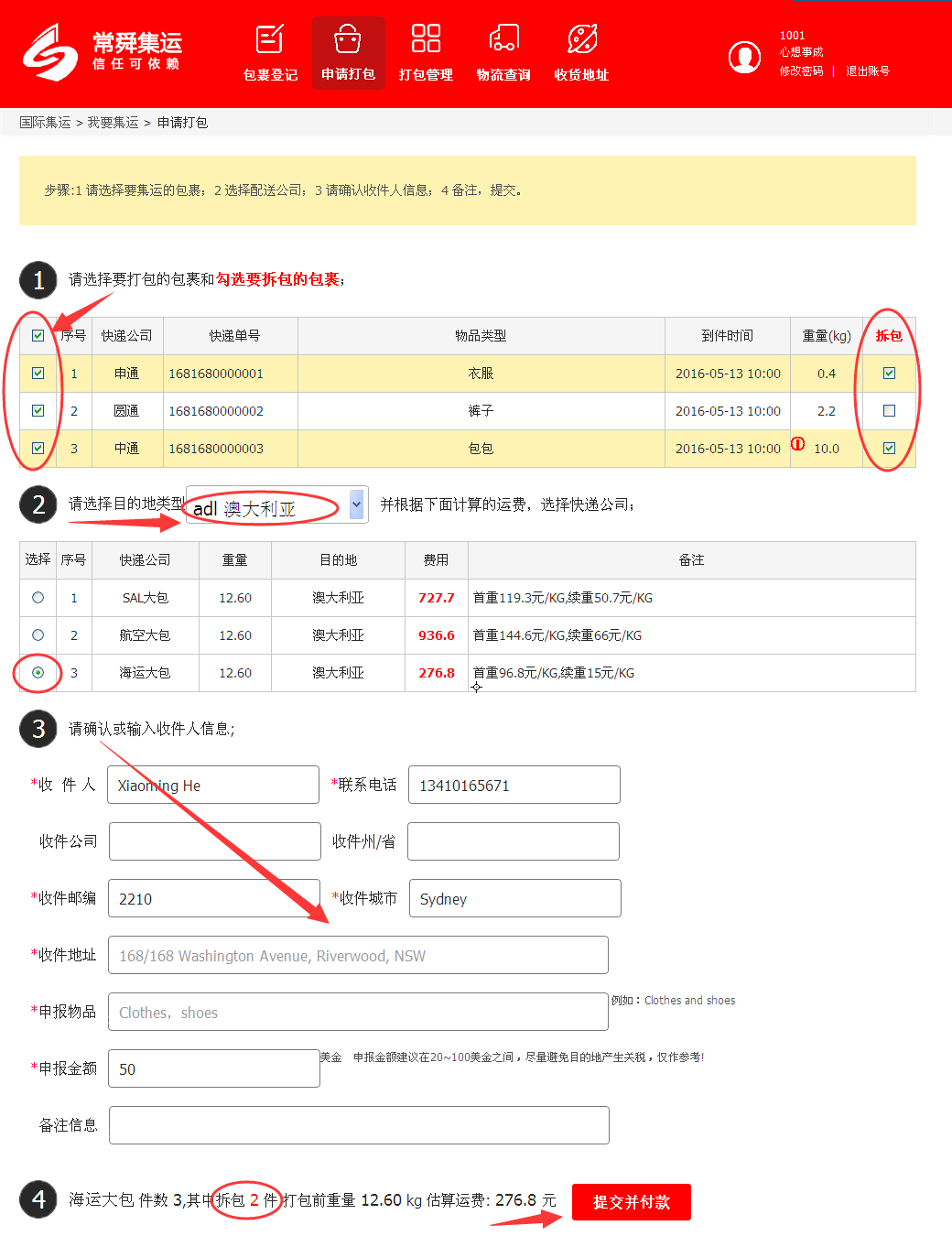 请选择要打包的包裹,选择目的地,选择运输方式,输入准确详细的地址,选择合并方式,如有要求 请备注里面填写,最后提交,请等待我们打好包计算好运费后会在旺旺通知您准确的重量和运费,给您连接付款!,付款后即可发货。(如单个包裹,无须合并的,请按选择运输方式对应的价格提交后,直接在店铺里面找个1元的连接,多少金额拍下多少件 即可,我们核对无误后,会直接发货)