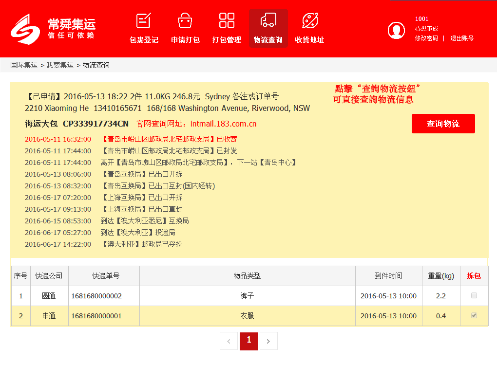 第五步:查询集运状态:打包中